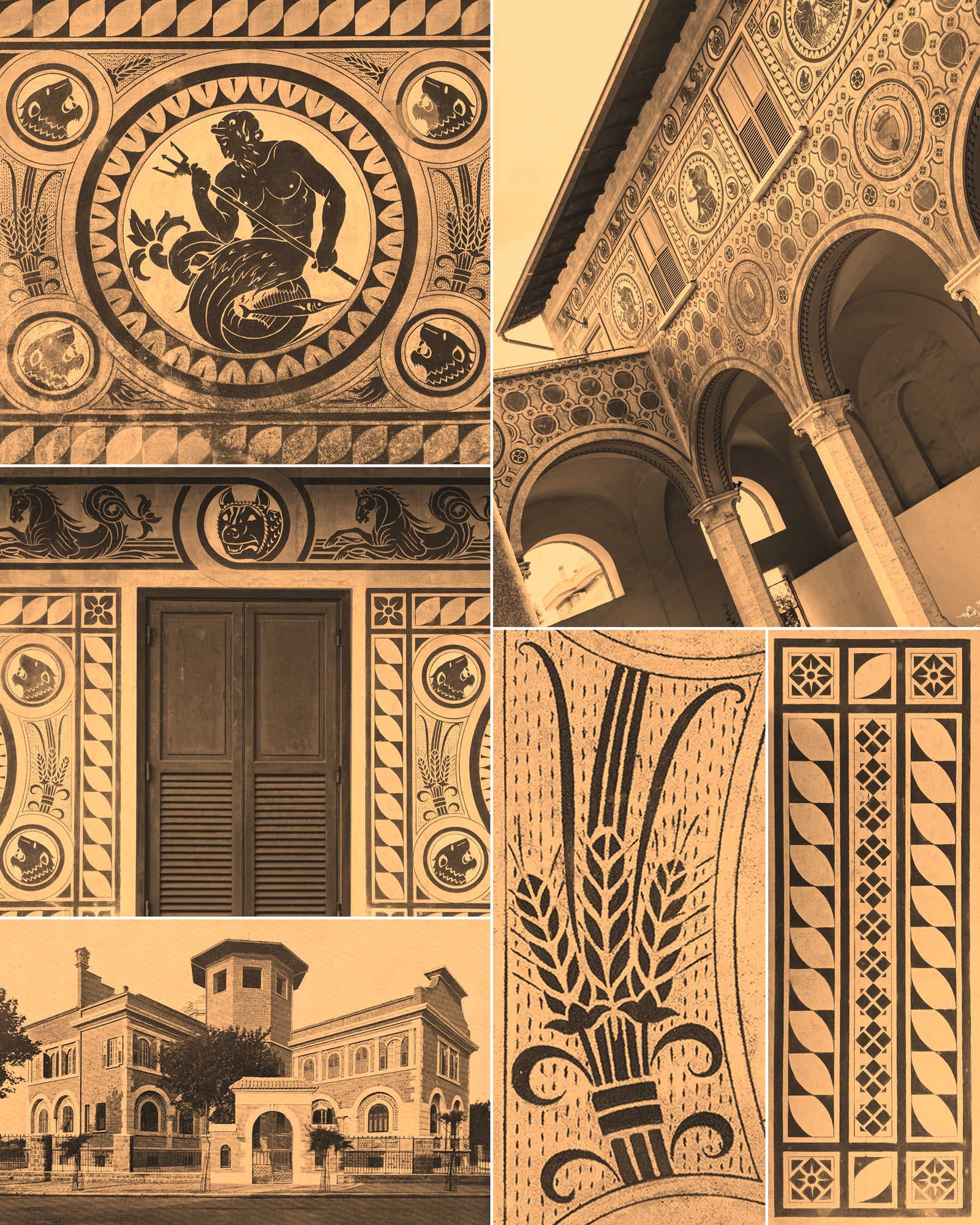 The most iconic elements of the cloister draw inspiration from Roman Mythology: Poseidon (god of the sea), the Hippocampus (mythological creature half horse and half fish), the Capitoline Wolf (symbol of the connection to Rome), and ears of corn (Ostia founded by Anco Marzio as a port for importing grain).