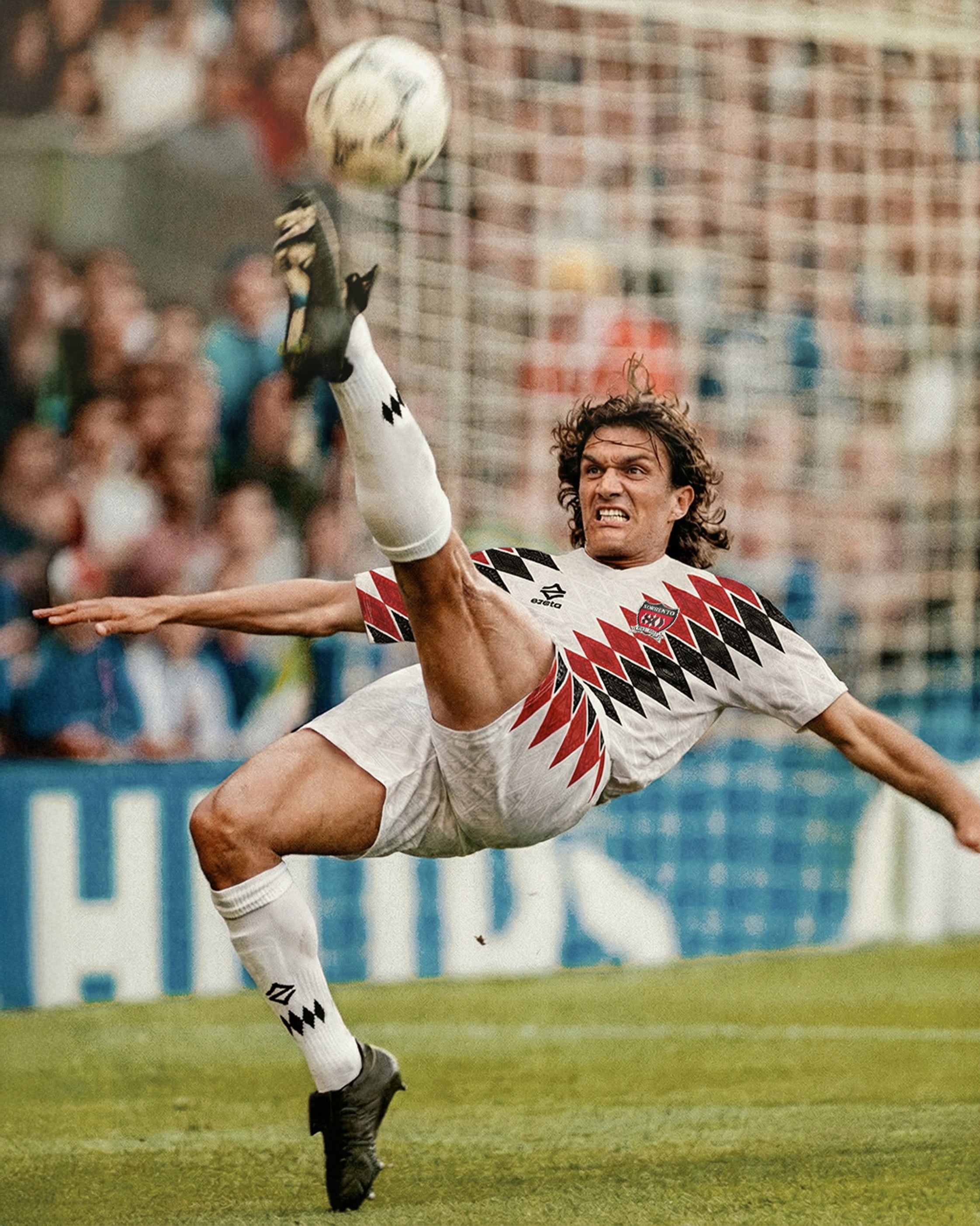 Back then, the kit was white, defined by its signature red-and-black diagonal sash.