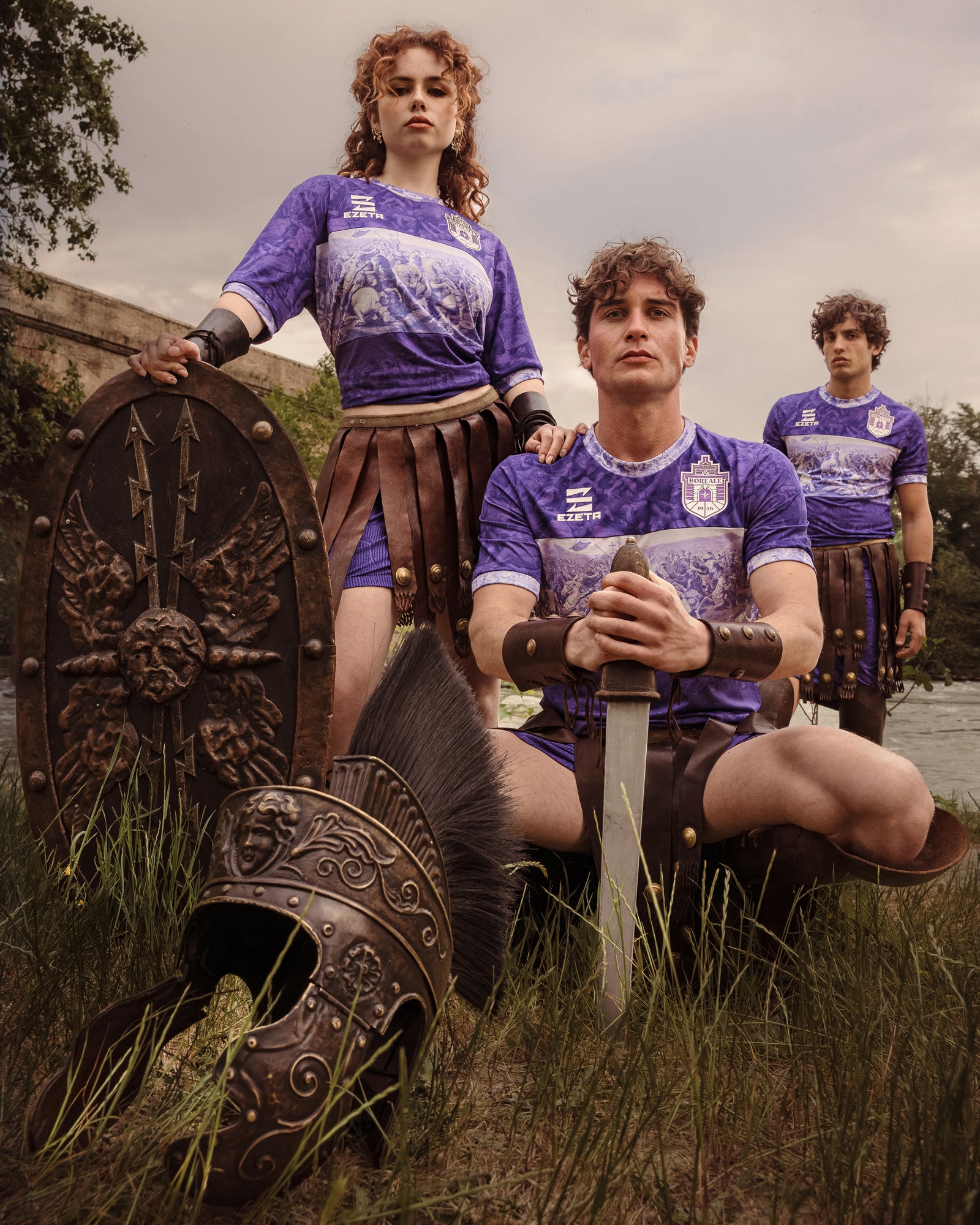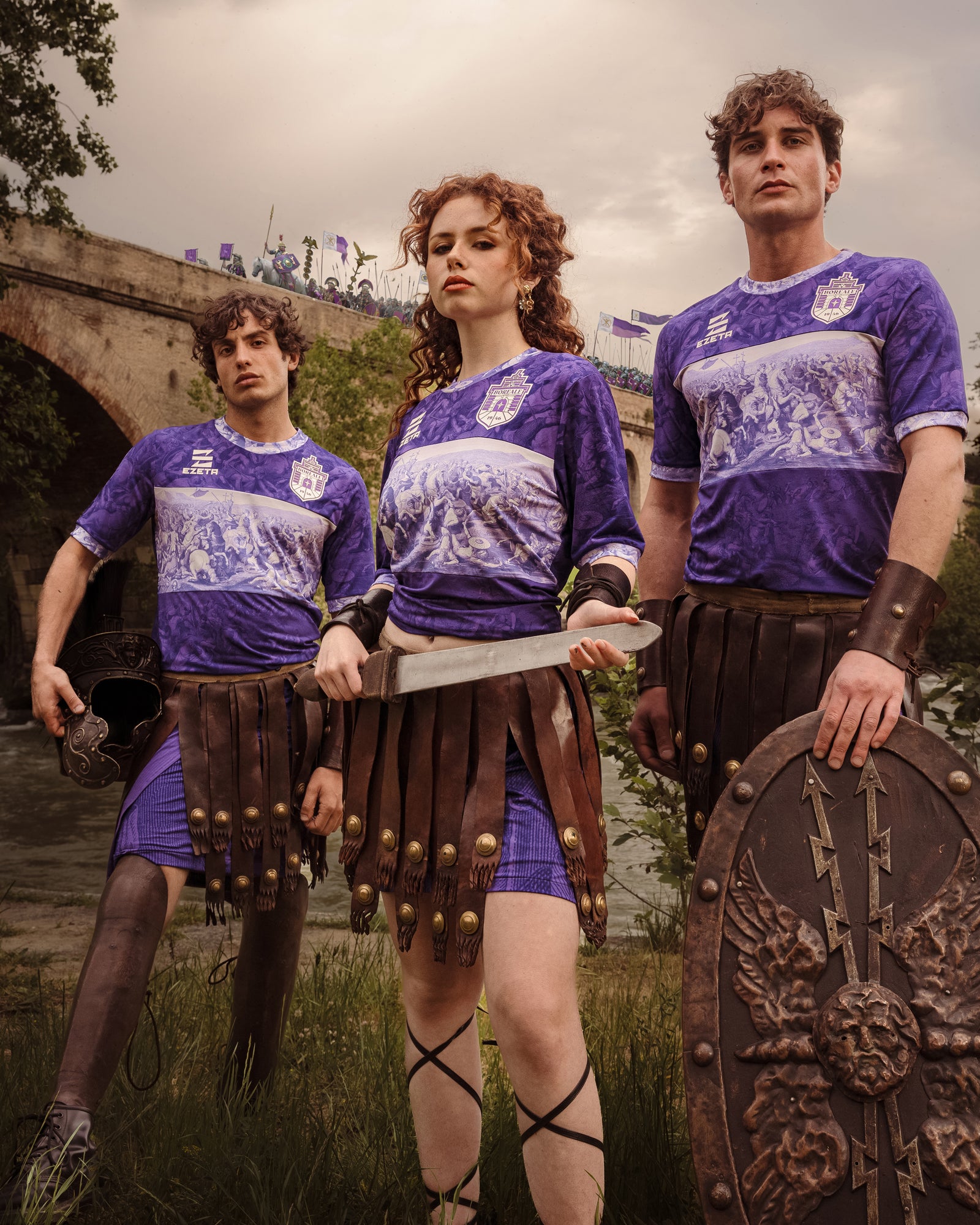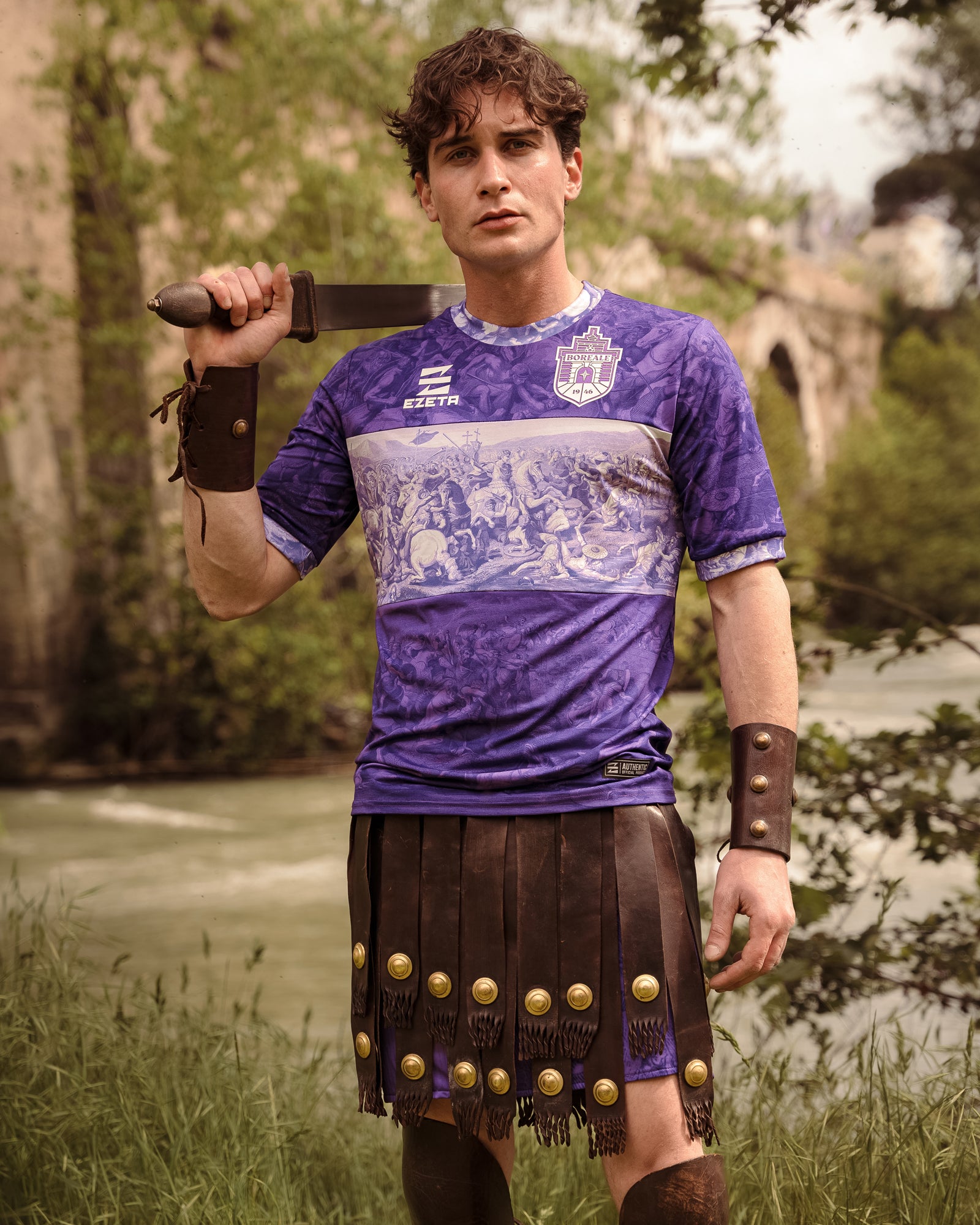 La maglia home è ispirata alla battaglia di Ponte Milvio, combattuta nel 312 d.C., che segnò la vittoria di Costantino su Massenzio e il trionfo del cristianesimo sul mondo pagano.
