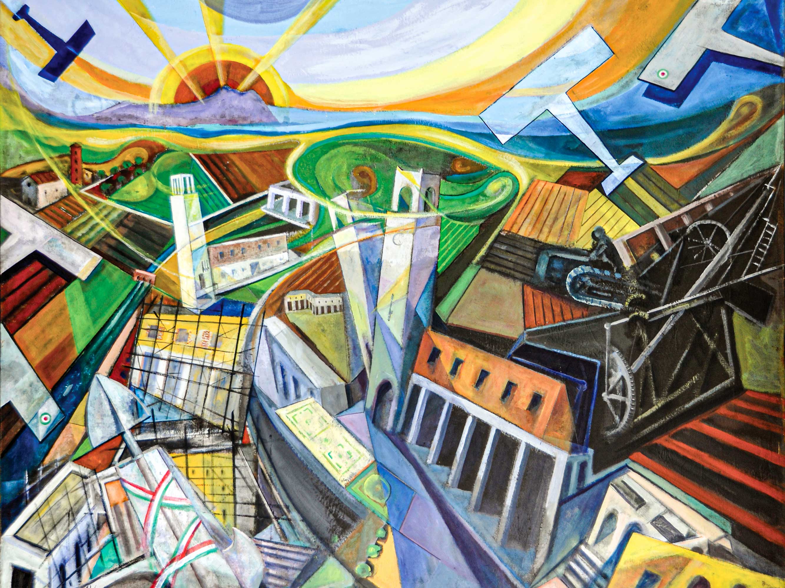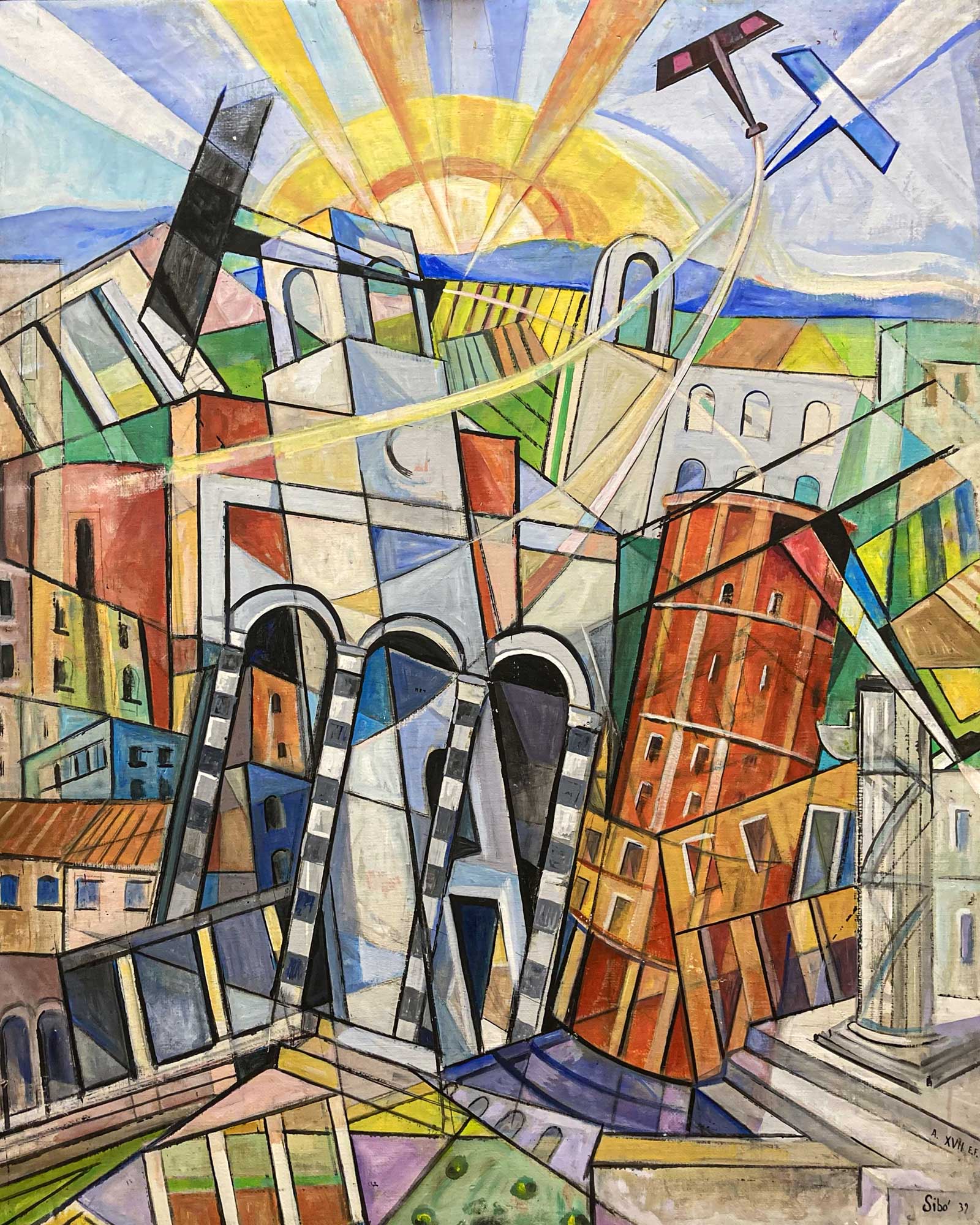 Gli occhi visionari dell'artista trasformano l'architettura razionalista in vibranti esplosioni di geometria e colore. I dipinti di Sibò sono un'eterna testimonianza del trionfo dell'umanità sulla natura e della grande bonifica delle Paludi Pontine.
