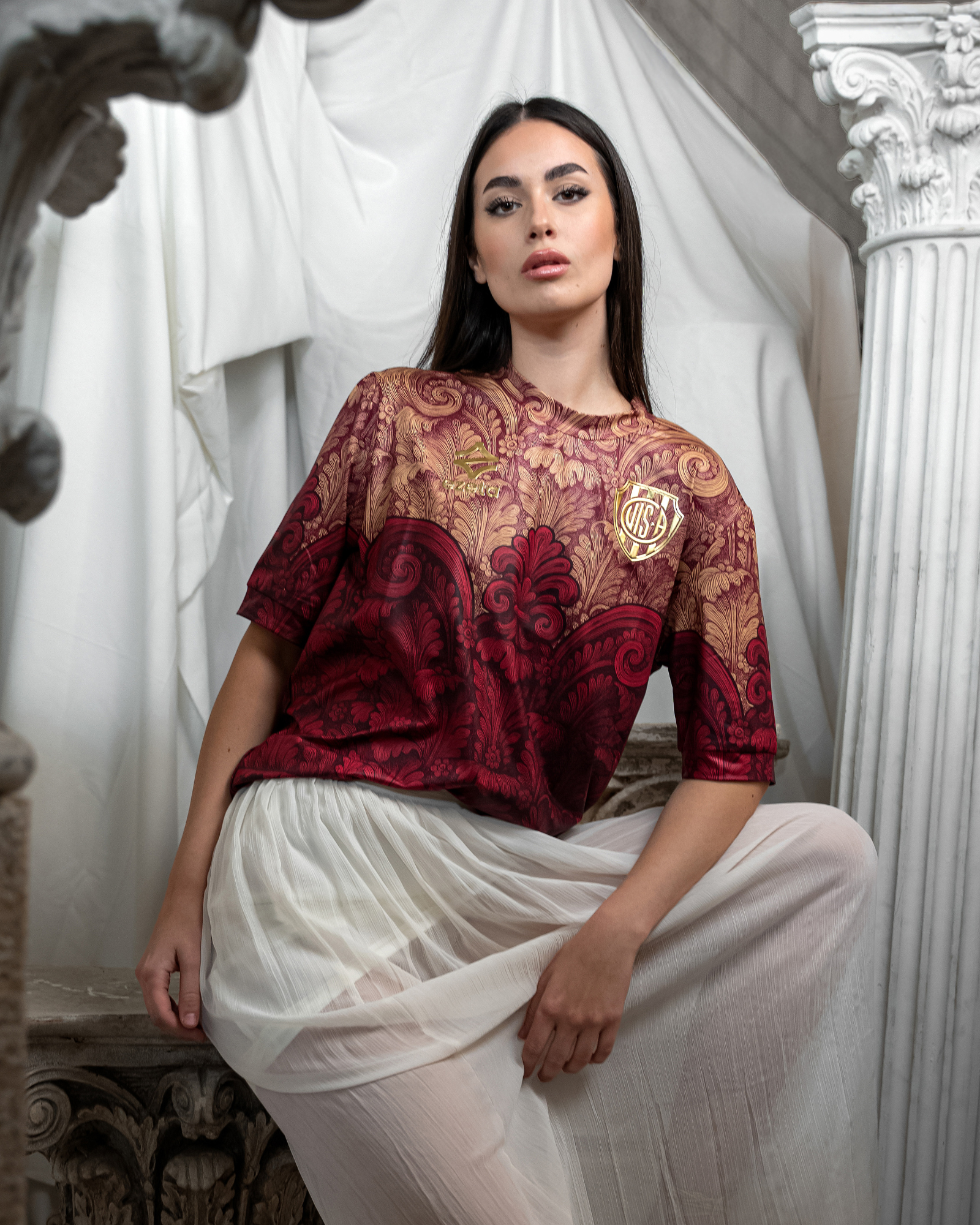 La maglia Away trae ispirazione dalle forme naturali e armoniose del capitello corinzio, simbolo dell’estetica classica romana.